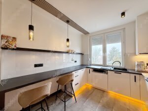 A lakás teljesen berendezett és gépesített. Két kényelmes hálószoba került kialakításra, mindkettőhöz külön gardróbhelyiség kapcsolódik. A korszerű konyha modern készülékekkel felszerelt, az előtér és az étkező terében pedig egy nagyméretű, egyedileg beépített tárolórendszer biztosítja a praktikus helykihasználást.